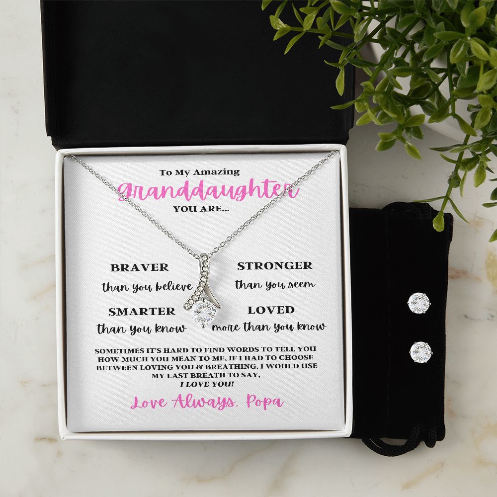 Celebrate the beauty and love of your amazing granddaughter with the Alluring Necklace and Earrings Set. Crafted with exquisite detail, this set is more than just jewelry—it's a reminder of the endless love and admiration you have for her. Each time she wears it, she'll be reminded of the special bond you share. Make her day brighter with the Alluring Necklace and Earrings Set.