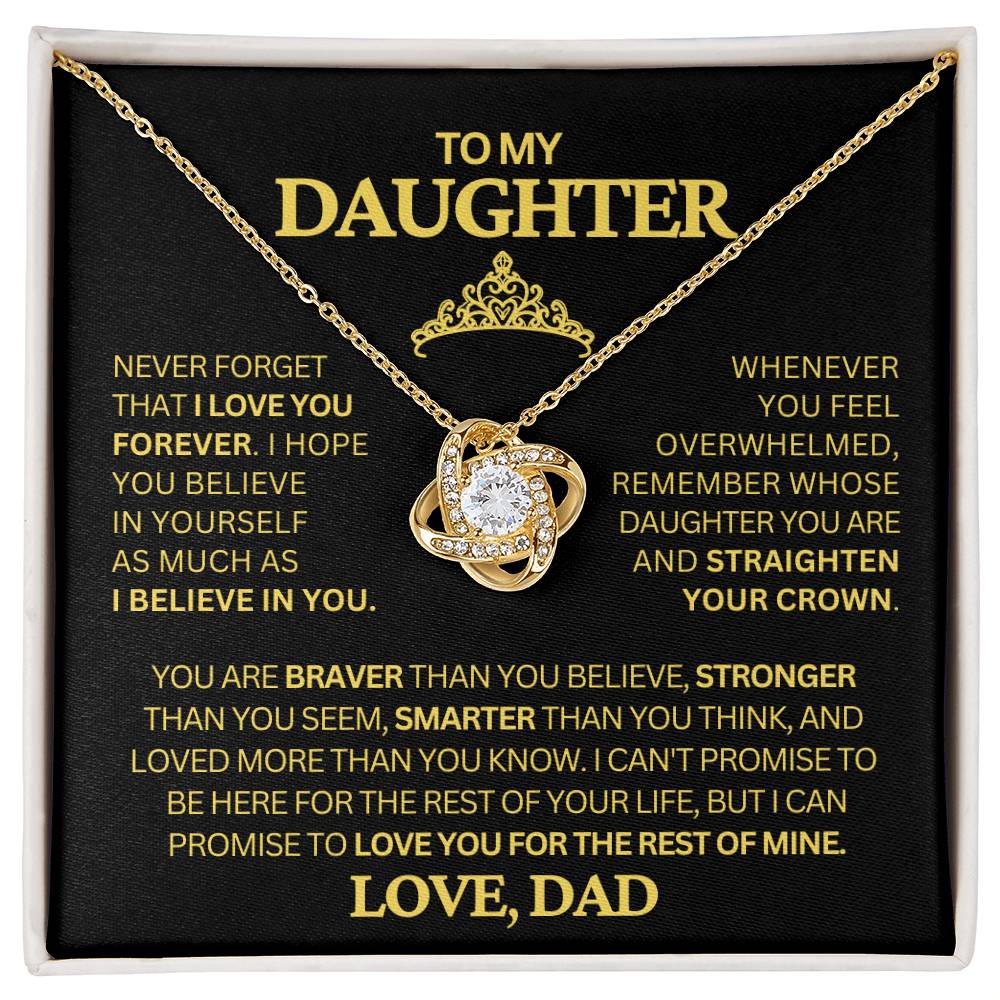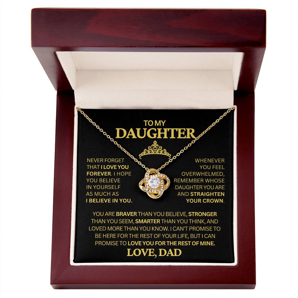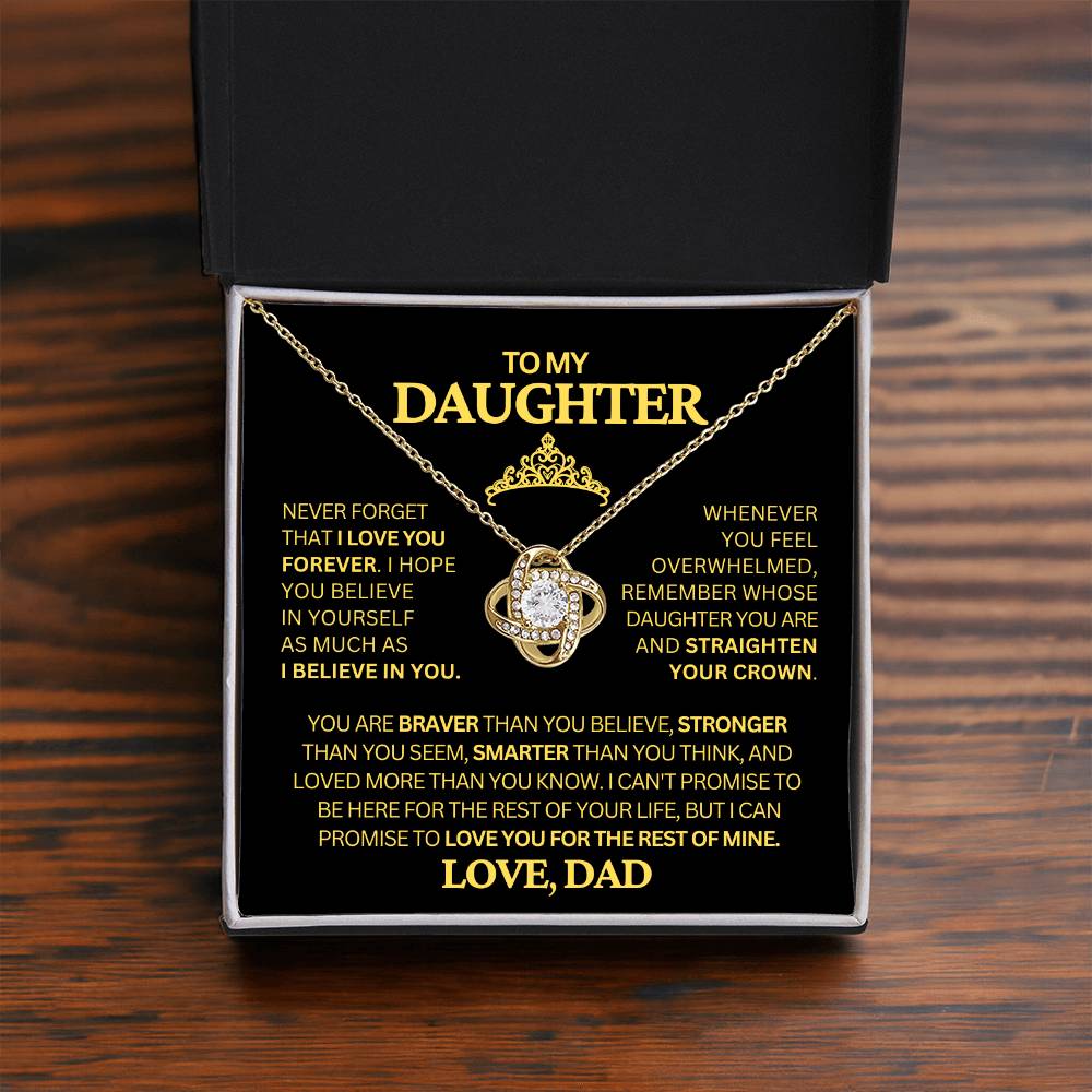 Surprise your daughter with a meaningful gift from Dad – our exquisite Love Knot Necklace. Each knot represents the strong and enduring bond between a father and his daughter, making it a symbol of love, protection, and guidance. Crafted with high-quality materials and adorned with sparkling gems, this necklace is as beautiful as your daughter's spirit. Whether worn for special occasions or as a daily reminder of your love, our Love Knot Necklace from Dad is sure to become one of her most cherished possessions.Never forget that I love you forever-whenever you feel overwhelmed remember who's daughter you are and sraighten out that crown!