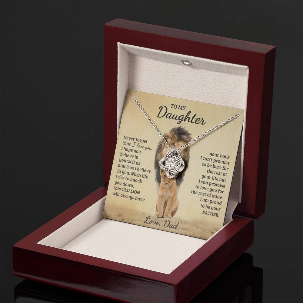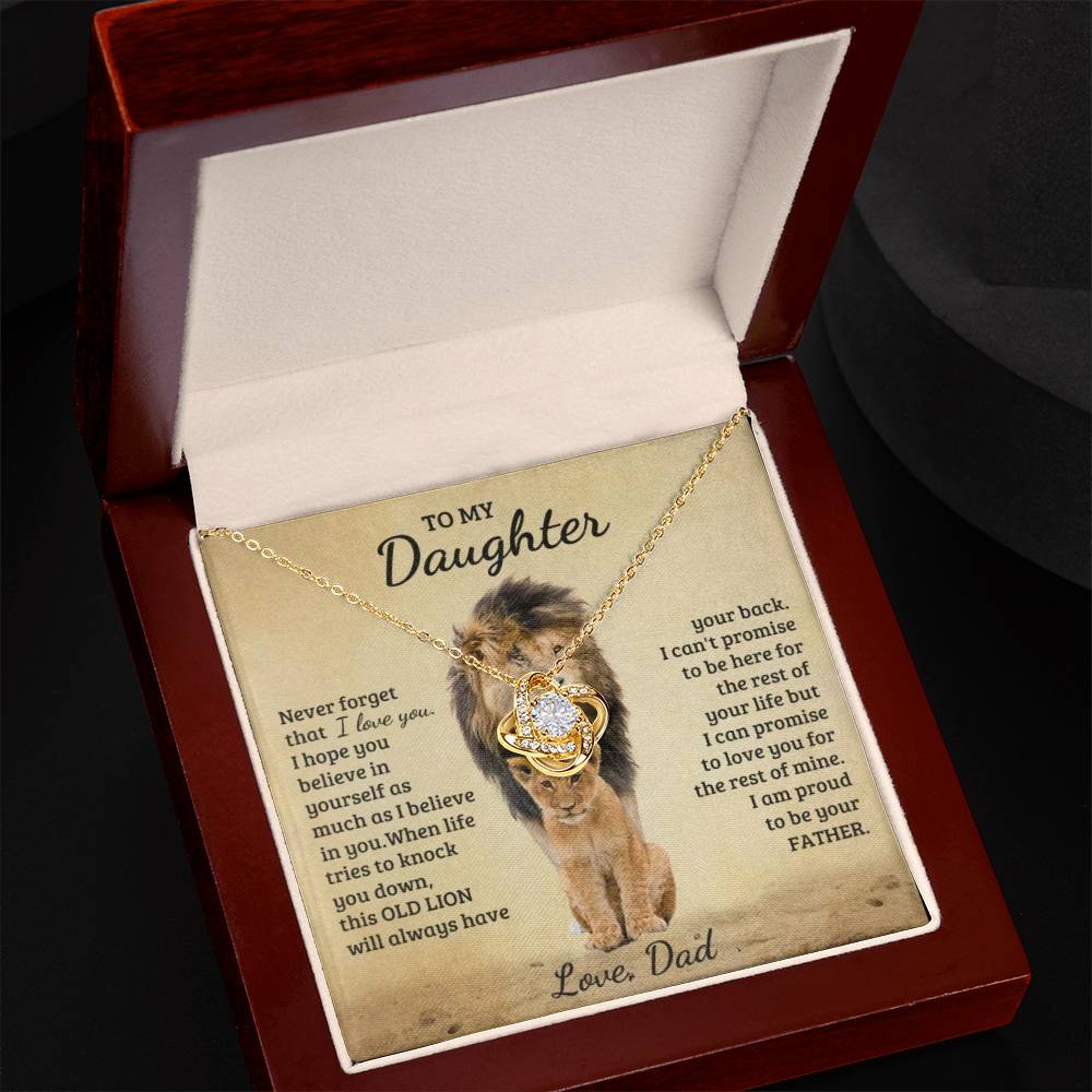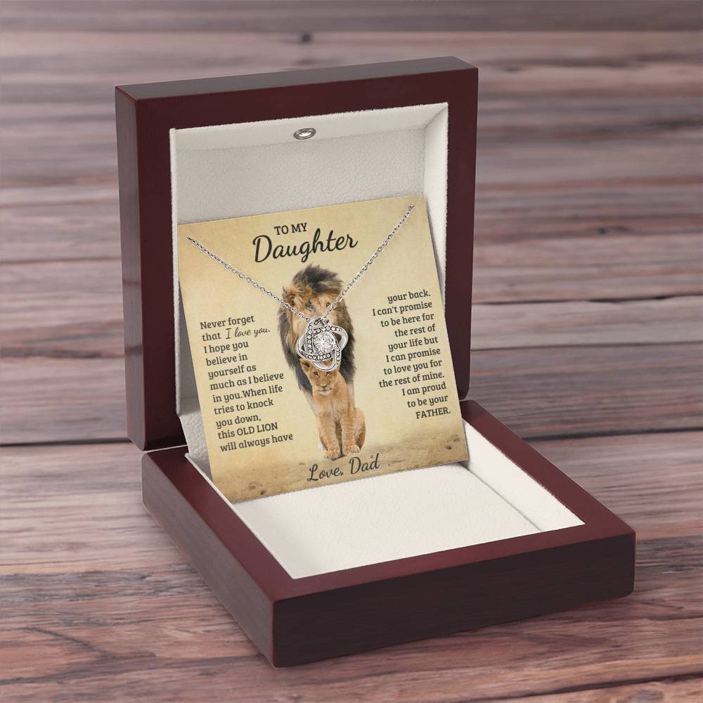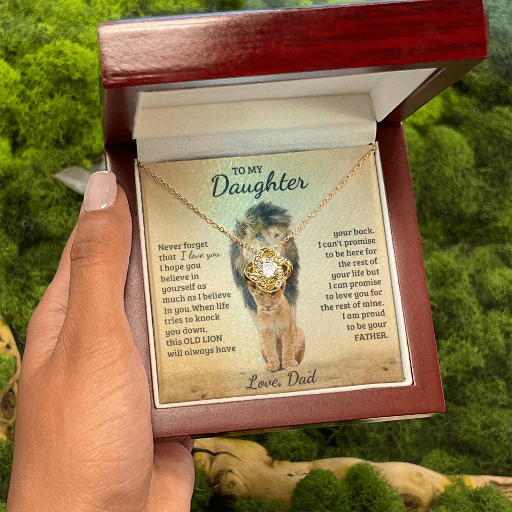 Surprise your beloved daughter with a token of your everlasting love – our stunning Love Knot necklace. Crafted with precision and adorned with sparkling gems, this necklace radiates elegance and sophistication. The intertwining knots symbolize the unbreakable bond between parent and child, serving as a constant reminder of the love and devotion you share. Whether worn for special occasions or as an everyday accessory, our Love Knot necklace is sure to make your daughter feel cherished and loved.