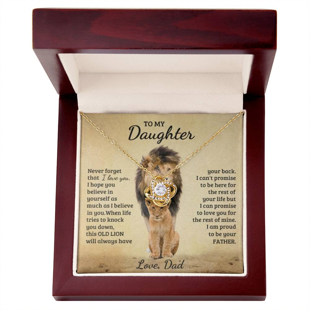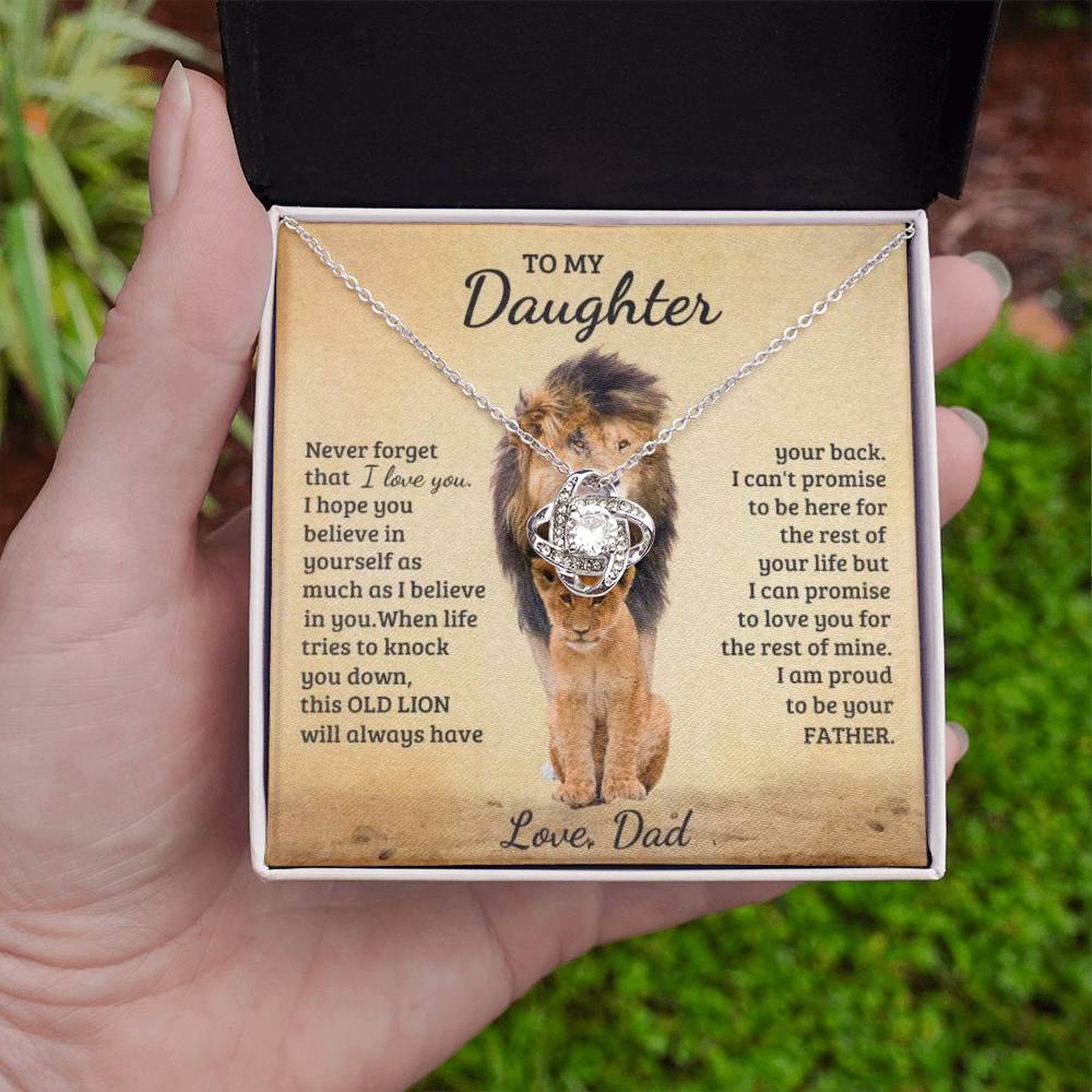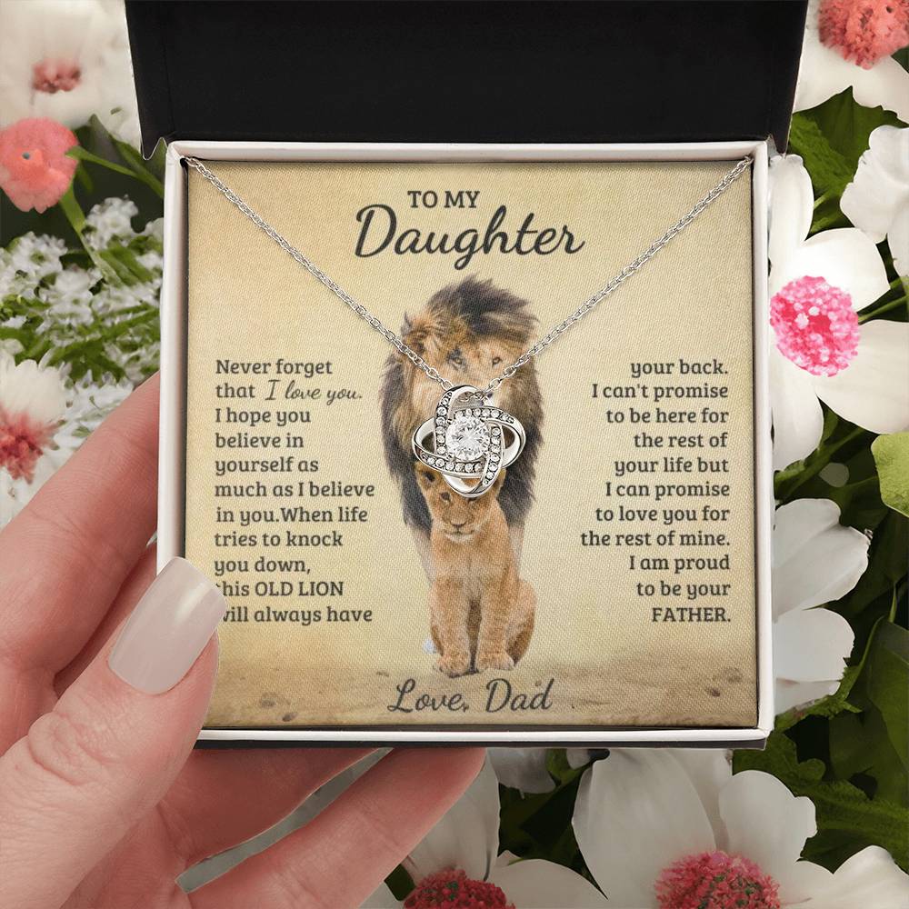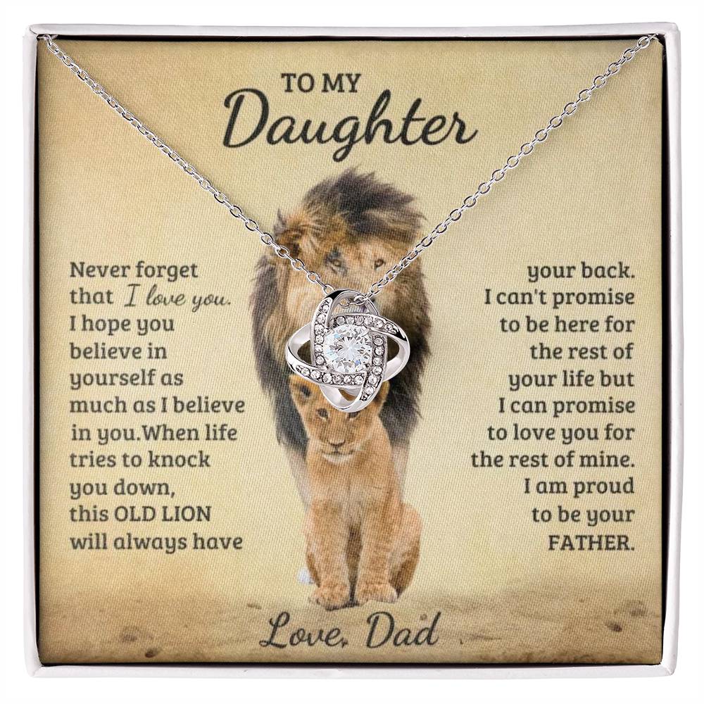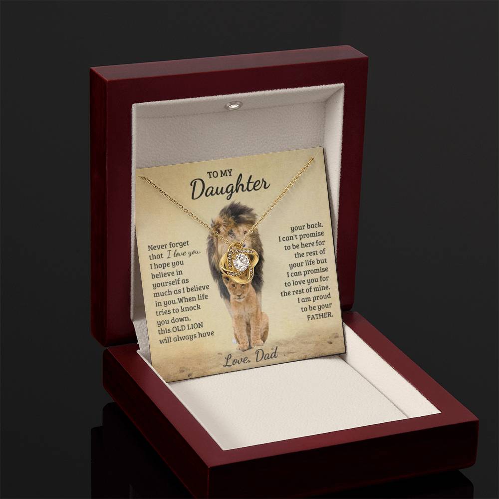 Surprise your beloved daughter with a token of your everlasting love – our stunning Love Knot necklace. Crafted with precision and adorned with sparkling gems, this necklace radiates elegance and sophistication. The intertwining knots symbolize the unbreakable bond between parent and child, serving as a constant reminder of the love and devotion you share. Whether worn for special occasions or as an everyday accessory, our Love Knot necklace is sure to make your daughter feel cherished and loved.