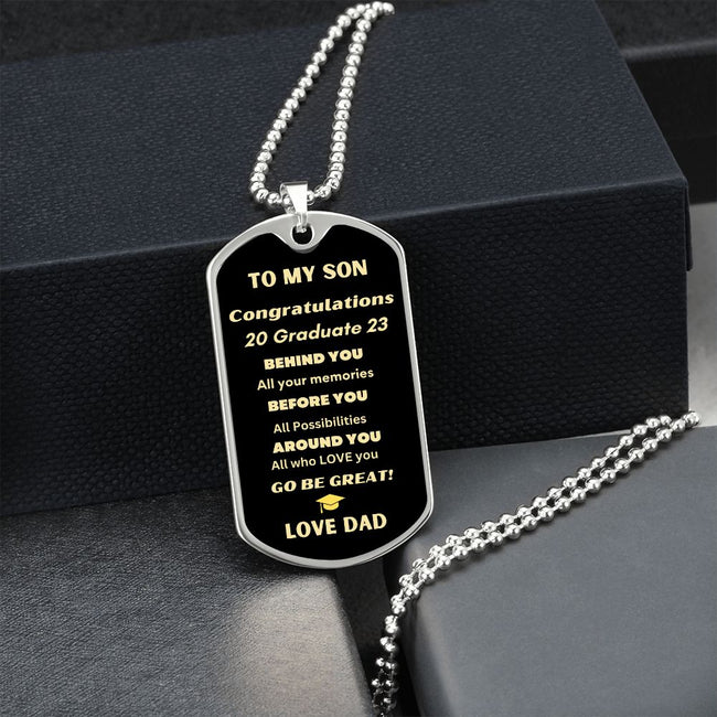 Surprise your son on his graduation with the Dag Tag Necklace! Crafted with care, this necklace carries the sentiment of a father's love and pride. Let him know you're always there for him with this heartfelt gift.
