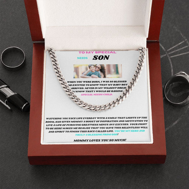 Surprise your special needs son with our Cuban Link Chain! Crafted with care and designed for durability, this accessory carries the sentiment of a parent's love and support. Let him wear it with pride and know that he's deeply loved.